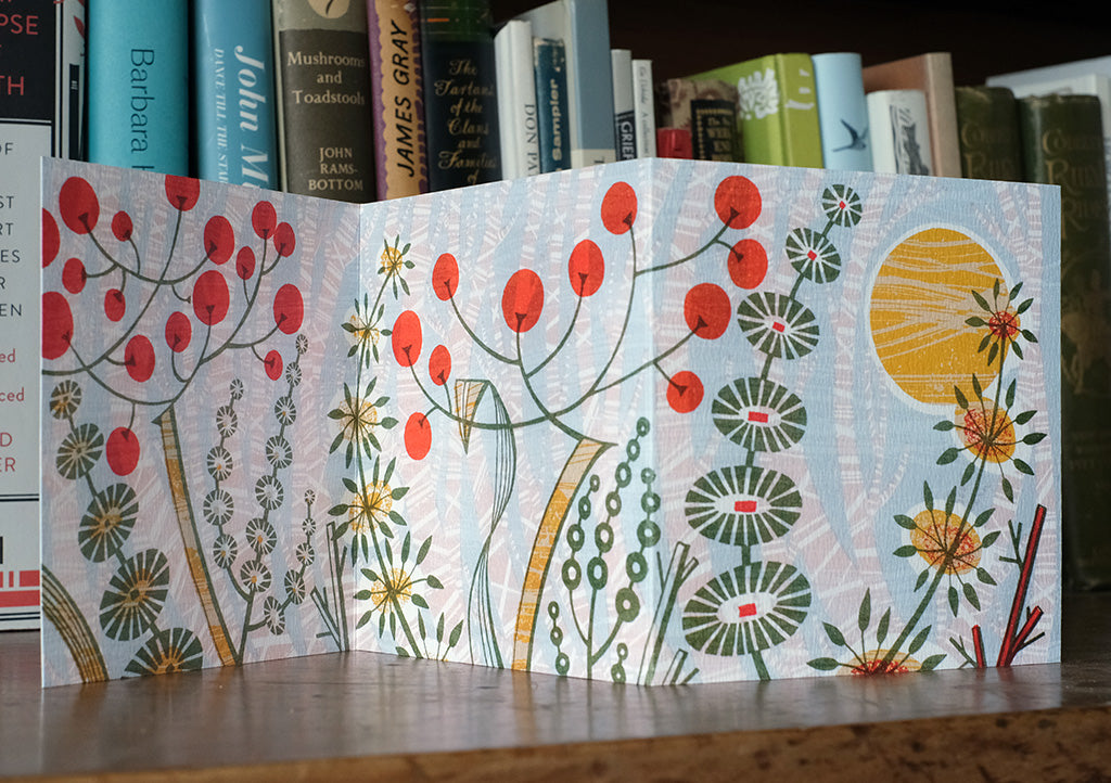 These concertina-folding cards are 375mm x 125mm when flat, 125mm x 125mm when folded. They are printed in the UK and are supplied ready folded in packs of 5 cards with envelopes.