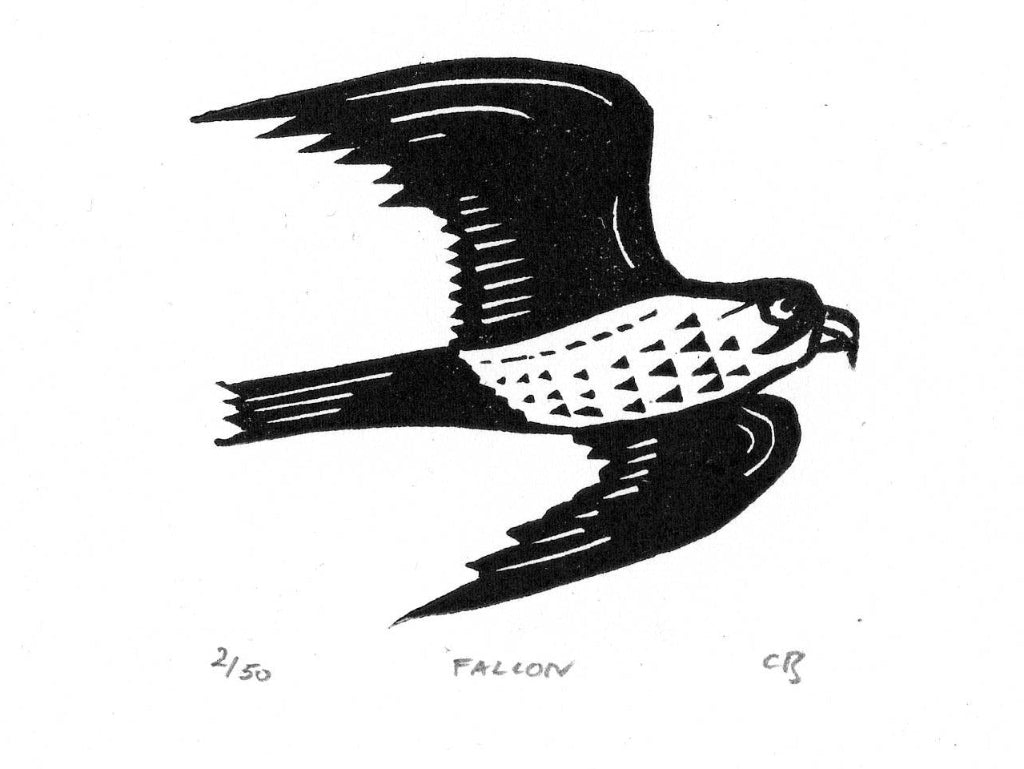 black white linocut of falcon by Christopher Brown